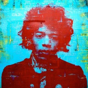 Much of Sumner’s work is heavily inspired by industrial areas, inner city life, and political/social movements of the past and present. Sumner’s mixed media process often involves the photographs of icons along with material used from found street flyers. These street flyers are Xeroxed and applied repeatedly to wooden canvases creating multiple stacked and torn layers of distressed, paper imagery. Her natural love of text is often implemented throughout her pieces by incorporating pages from books of poetry, verse, lyrics and theatrical plays.